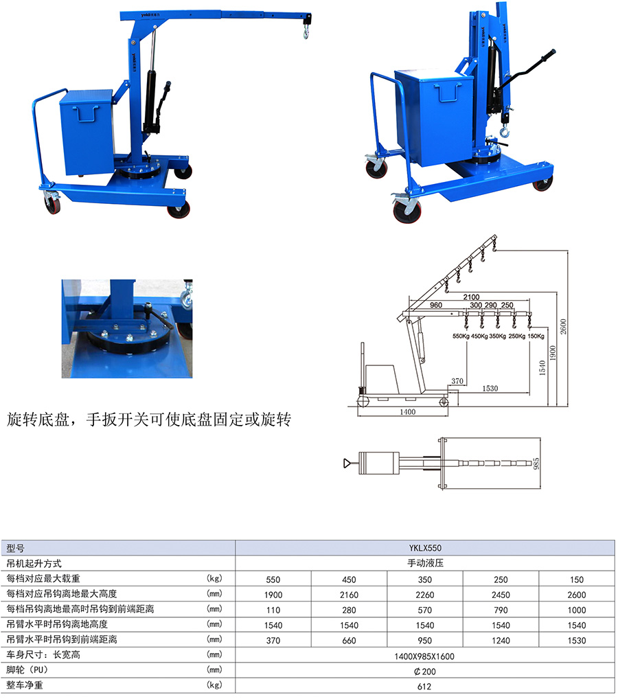 ● 吊臂長度可五工位手動(dòng)調(diào)節(jié)配有鍛造重載可旋轉(zhuǎn)吊鉤。